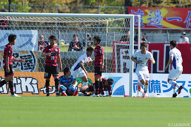 ビハインドを縮めたことで勢いに乗り、さらに攻勢を強める山形。後半44分には風間の左CKからPA内中央の中山がドンピシャのヘディングシュートを放つが、至近距離から下に叩きつけたボールはGK櫛引政敏が弾き出し、同点ゴールを許さなかった。